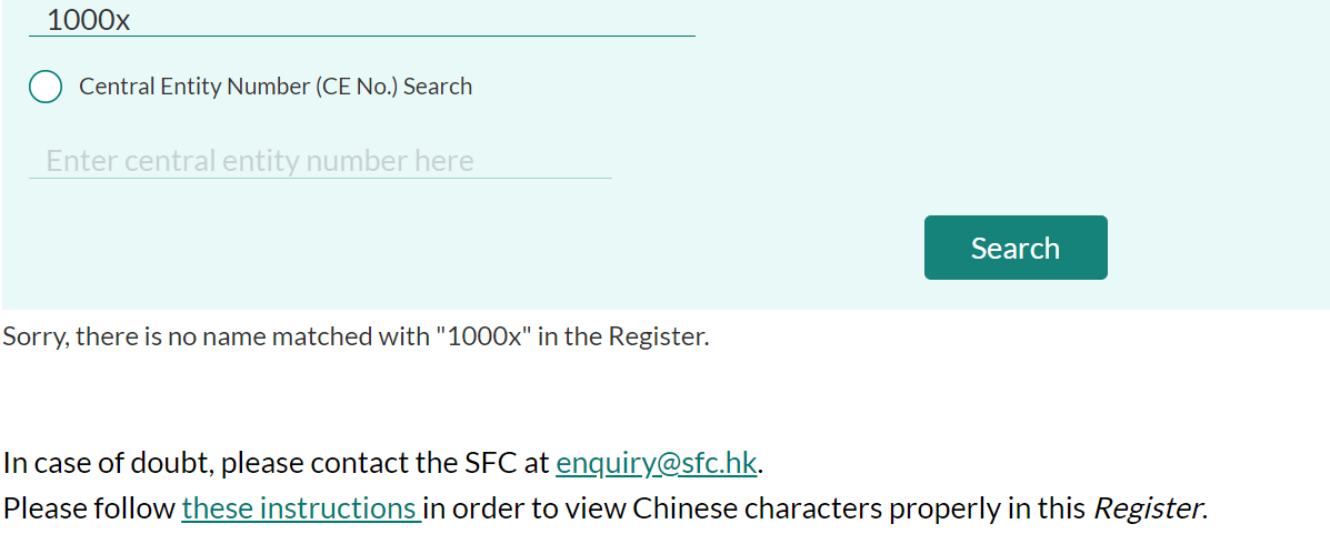 На официальной странице платформы указано, что брокер зарегистрирован в Гонконге и обладает лицензией локального регулятора SFC. Однако наши специалисты выяснили, что в реестрах комиссии нет никакого упоминания о псевдо-брокере 1000x. Очевидно, что перед нами очередной нелегальный СКАМ, который не имеет законных прав на предоставление своих услуг.