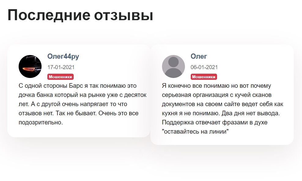 Отзывы Олега и Олега44ру подчеркивают общее недоверие к АК Барс Финанс. Они выражают сомнения в надежности компании, упоминая отсутствие положительных комментариев и задержки в выплатах. Олег, в частности, отмечает несоответствие между серьезным имиджем компании и реальным качеством предоставляемых услуг, что вызывает у него подозрения в мошенничестве.