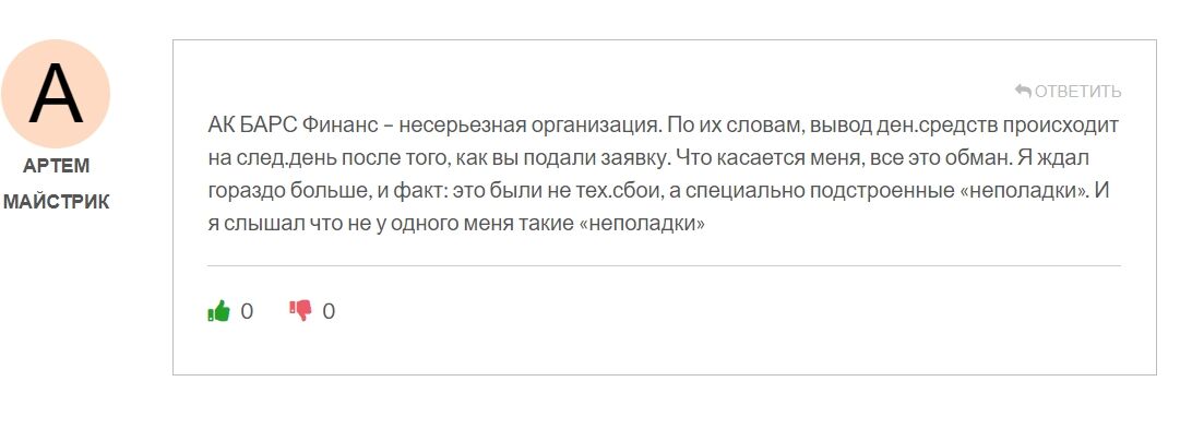 Анализ отзывов показывает, что клиенты испытывают значительное недовольство и недоверие к деятельности АК Барс Финанс. Заработать здесь точно не получится.