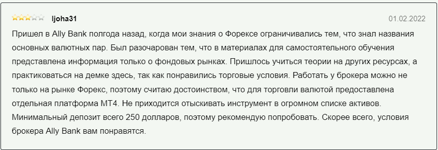 Ljoha31 пришел в Ally Financial с минимальными знаниями о Форексе и был разочарован недостатком образовательных материалов по данной теме. Все обучающие материалы были фокусированы только на фондовых рынках. Однако, этот пользователь выделил как преимущество хорошие торговые условия и доступность платформы MT4 для торговли валютой. Минимальный депозит в размере 250 долларов также оценен как плюс.
