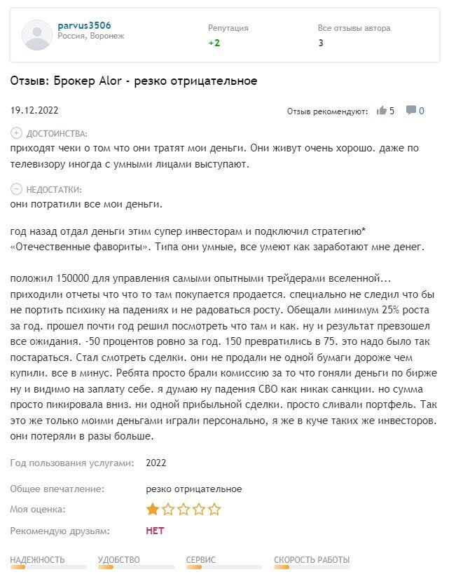 В то же время из-за Alor остаются без бабла. Пострадавших много. Например, на otzovik.com человек пожаловался: год назад подключил инвестиционную стратегию удилы (это разновидность доверительного управления). Ему обещали 25 % годовых.