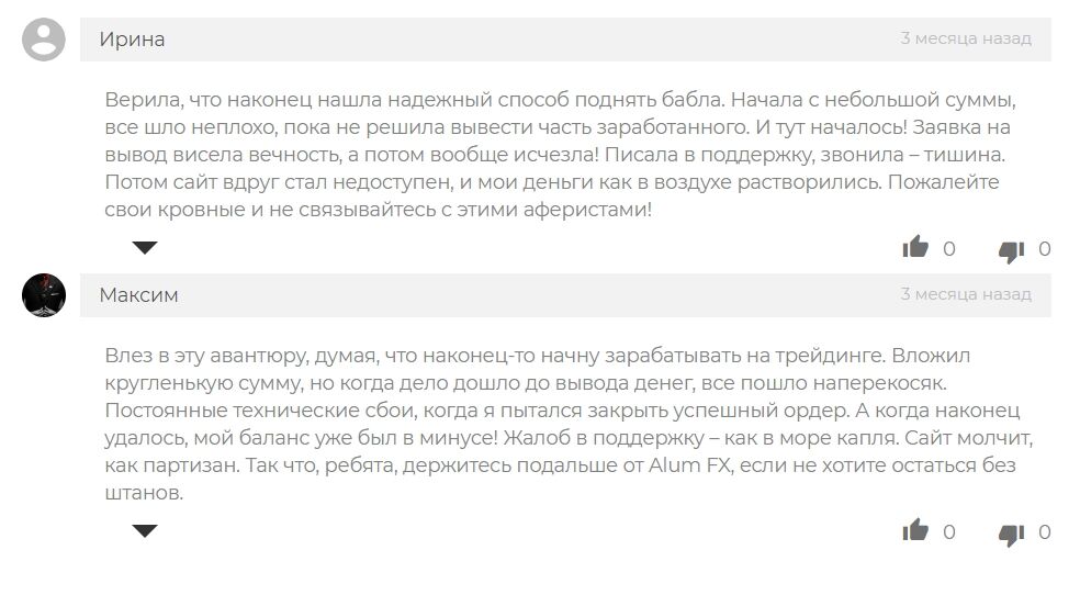 Эти отзывы отражают общую картину недовольства и разочарования среди клиентов АлумФХ. Еще никто не заработал, торгуя на рассматриваемой платформе.