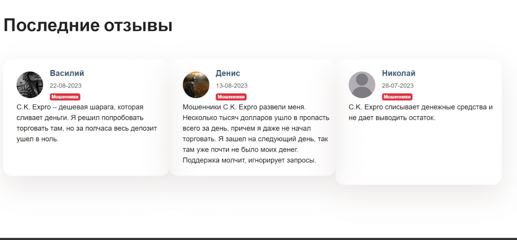 Поскольку мы имеем дело с молодой организацией, комментарии только начинают появляться. Очевидно, что сервис оказывает услуги относительно недавно, плюс еще не запущена рекламная кампания. Соответственно, это существенно усложняет поиск реальных отзывов о C.K. Expro. В большинстве случаев клиенты не смогли вывести деньги.