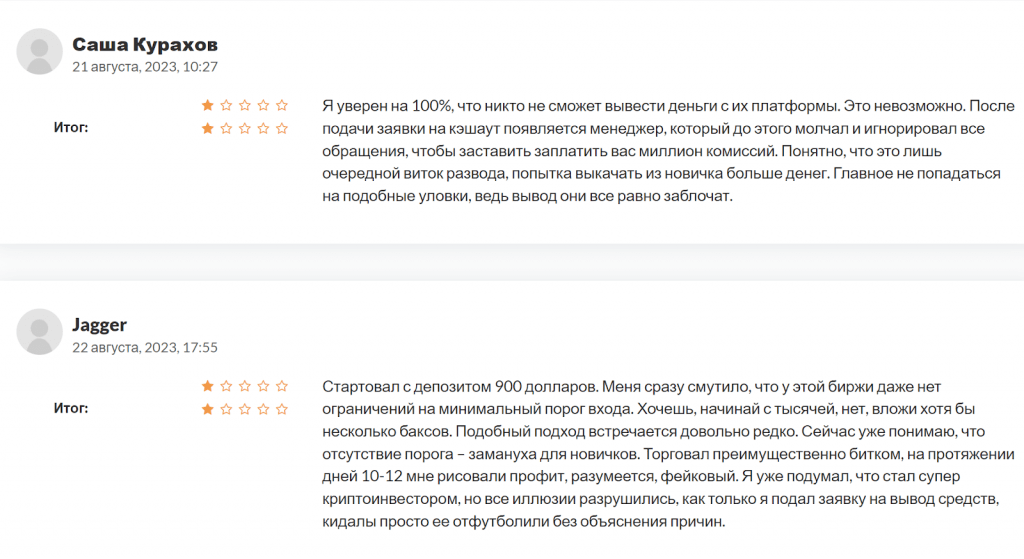 - манипуляции и игнорирование запросов на вывод средств, что приводит к потерям;