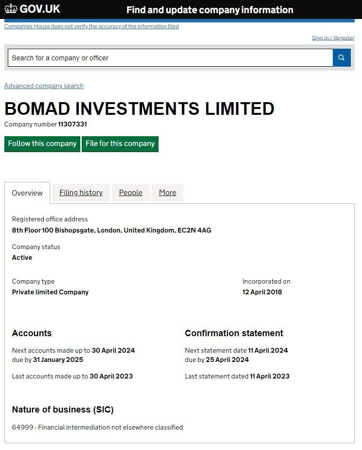 В Companies House всплыл Bomad Investments Limited. Данная организация прошла регистрацию в 2018 году. Специализируется на финансовом посредничестве, которое не указано в других категориях отраслевых кодов. Судя по самым свежим документам, ее уставной капитал — £ 3,3.