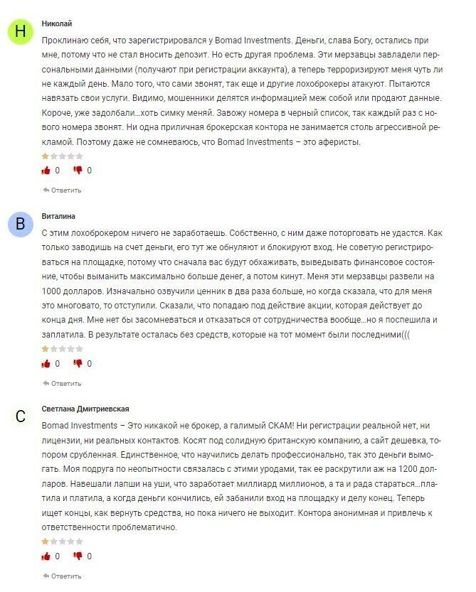 Правду о лохотроне рубят на сайте otziv-broker.com. Экс-жертвы предостерегают: баблосос «Бомад Инвестментс» навязывается сам. Может позвонить или написать имейл. Задуривает голову, выманивает тысячи грина и дает пинок под зад.