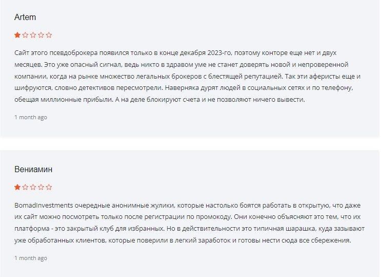 На brokertribunal.com отзыв говорит: сайт жулика «Бомад Инвестментс» появился в декабре 2023-го. Контора совсем свежая.