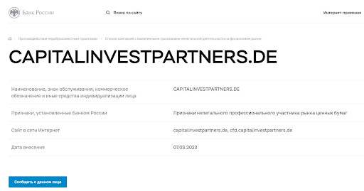 Внимание: ЦБ РФ отправил мошенника Capital Invest в свой черный список в марте 2023-го. То есть он оказался там практически сразу после появления.