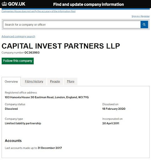 Rating Forex прошерстил реестр Companies House. Там действительно была компания Capital Invest Partners. Она зарегистрирована в 2011-м. Ликвидирована в 2020-м. То есть за 3 года до регистрации сайта capitalinvestpartners.de, где бросил якорь тухлый лохотрон Capital Invest. К тому же Capital Invest Partners числился бездействующим с 2015 года.