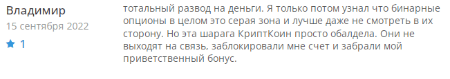 На сайте scaud.info были обнаружены отзывы о компании CryptCoin24. Большинство из них имеют отрицательное значение. Это не удивительно, ведь этот брокер не выполняет своих обязательств по сотрудничеству с клиентами. Так, Владимир написал, что бинарным опционам вообще нельзя доверять, а что касается организации Крипт Коин 24, то это полнейший лохотрон. Они самовольно заблокировали его счет и отобрали приветственный бонус.
