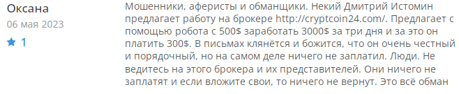 Оксана выразила мнение, что брокер CryptCoin24 – это обманщики во главе с Дмитрием Истоминым. Они предлагают зарабатывать на бинарных опционах с помощью робота. С 500 можно получить 3000 всего за 3 дня. Они клянутся, что помогут во всем разобраться и правильно настроить, но на самом деле вы только безвозвратно потеряете свои деньги.