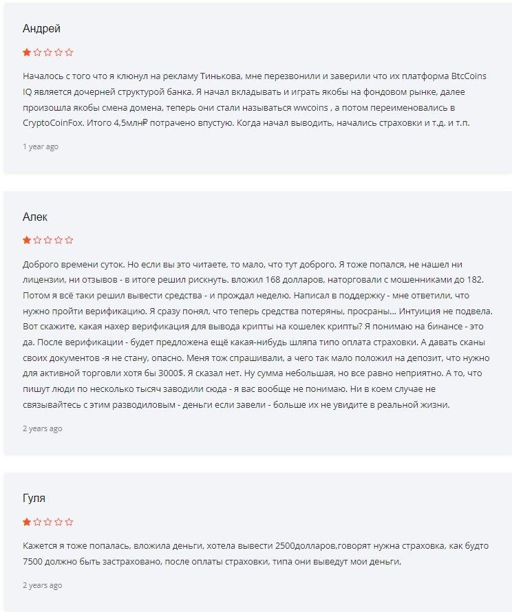На brokertribunal.com тоже хватает жалоб. Один человек рассказывает: что наткнулся на рекламу от Тинькова. Оставил контакты. В итоге бедолагу заманивали в лохотрон, который выглядит точь в точь как CryptoCoinFox. Развели на ₽ 4,5 млн.