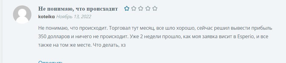 Отзывы о Esperio подчеркивают ряд серьезных проблем. Все эти факторы создают негативное впечатление о компании и вызывают сомнения в ее надежности и профессионализме.