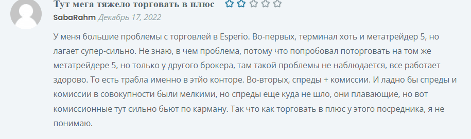 Трейдер упоминает проблемы с торговлей на платформе Esperio. Он отмечает, что терминал метатрейдер 5, который используется компанией, имеет значительные задержки и лаги. Пользователь сравнивает это с опытом работы на том же терминале у другого брокера и подчеркивает, что проблемы возникают именно с Эсперио.