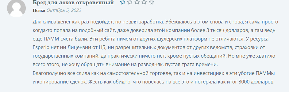 Еще один клиент делится своим опытом и предупреждает о возможных рисках. Он утверждает, что Esperio не обладает лицензией от Центрального Банка или других регулирующих органов. Пользователь указывает на отсутствие страховки от государственных компаний и сомневается в надежности этого брокера. Он описывает свой собственный ужасный опыт потери средств, как при самостоятельной торговле, так и при инвестировании в ПАММ-счета, и приходит к выводу, что Esperio — это обман.