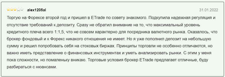Алекс начал сотрудничество с ETRADE из-за надежной регуляции и отсутствия требований к минимальному депозиту. Однако, он неожиданно обнаружил, что максимальный уровень кредитного плеча составляет всего 1:1,5, что не характерно для Форекс-брокеров. Это выяснилось потому, что ETRADE — фондовый брокер, а не Форекс. Несмотря на это, Алекс остался и решил попробовать себя на фондовом рынке.