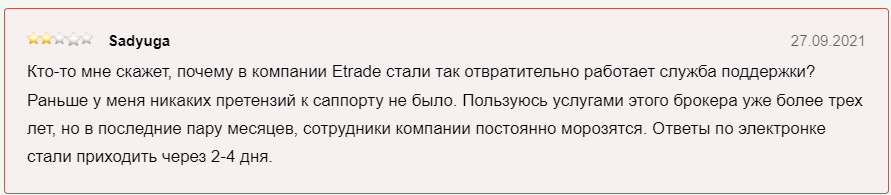 Sadyuga является долгосрочным клиентом E*TRADE, однако в последние пару месяцев он столкнулся с проблемами в работе службы поддержки. Ответы на электронные письма теперь приходят с большими задержками, что вызывает у него недовольство.