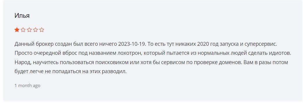 Отзывы на brokertribunal.com кричат о кидняке. Один человек рассказывает: сайт шарашки был зарегистрирован в октябре 2023-го. То есть не мог работать с 2020-го. Это очевидный вброс.