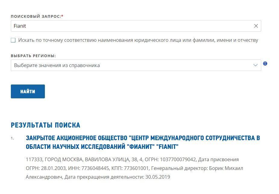 Сайт лохотрона Fianit доступен только на русском языке. Значит, его можно проверить в ЕГРЮЛ. Единственное совпадение в российском реестре юриков относится к международной научно-исследовательской организации. Она работает с 2003-го. Наш герой к ней не относится.