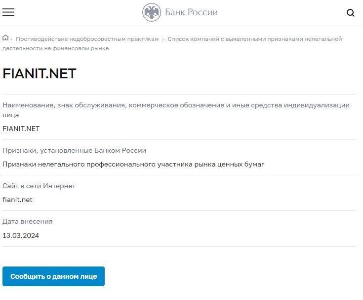 Rating Forex прошерстил реестр лицензий ЦБ РФ. Там «Фианит» не всплыл. Зато он вынырнул в черном списке российского финрегулятора. Удила оказался там 13 марта 2024-го.