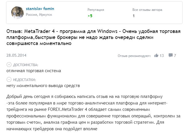 О торговой площадке МетаТрейдер 4 положительные отзывы от трейдеров, которые ответственно отнеслись к выбору брокера. В них отражены преимущества площадки – ее функциональность, корректность исполнения ордеров и множество опций, которые помогают в торговле.