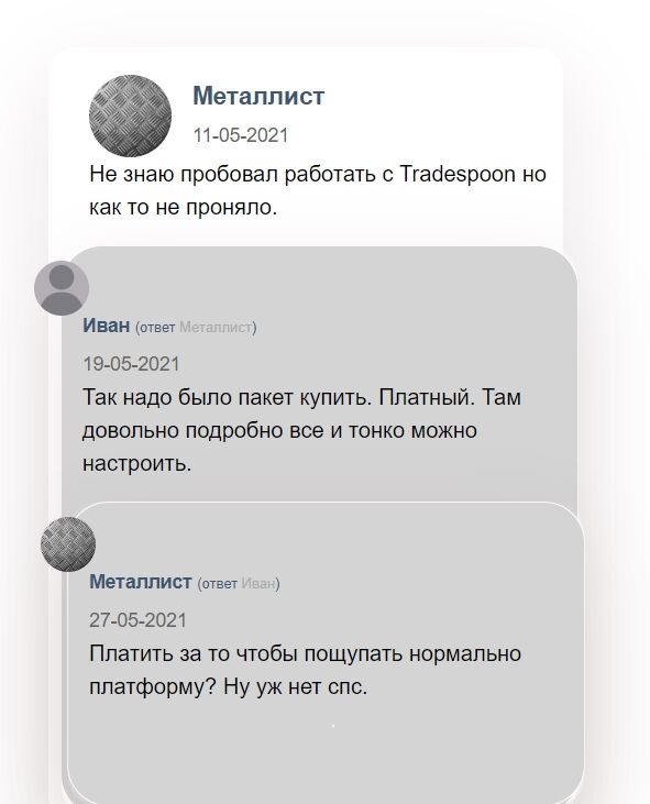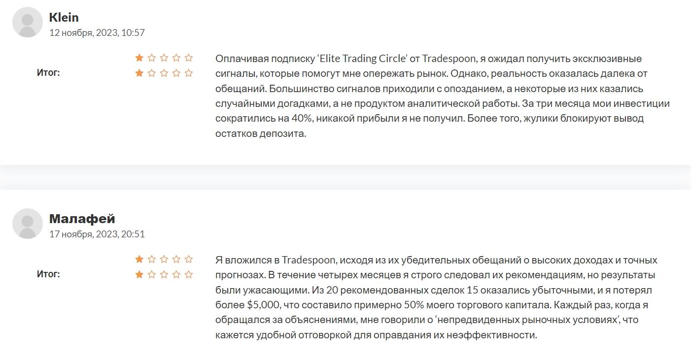 Малафей подчеркнул убыточность следования рекомендациям Tradespoon, потеряв значительную часть своего капитала. Ответы службы поддержки, ссылающиеся на непредвиденные рыночные условия окончательно подтвердили сомнения в честности проекта.