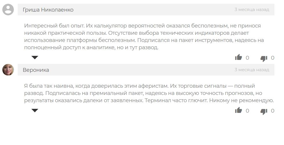 Вероника поделилась своим опытом использования премиального пакета, ожидая высокую точность прогнозов, но результаты не соответствовали ее предварительным оценкам, а торговые сигналы оказались ненадежными. Проблемы с работой терминала также были упомянуты как часть ее негативного опыта.
