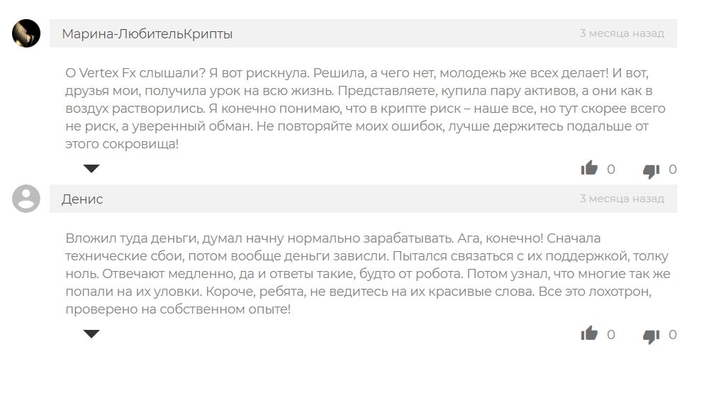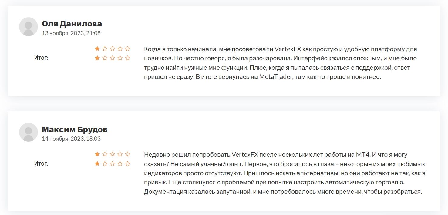- общий вывод из отзывов пользователей складывается в пессимистичную картину, согласно которой ВертексФХ кажется ненадежной и проблематичной платформой, с которой сталкиваются технические трудности, вызывающие убытки и недовольство среди пользователей.