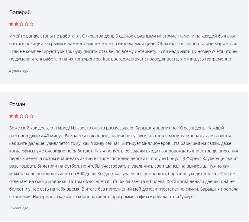 Есть жалобы на brokertribunal.com. Автор одного из отзывов предупреждает: у Forex Club стопы не работают. Он пробовал на 5 разных инструментах. Каждый раз позы закрывались по цене, которая была гораздо хуже установленной в стопе.