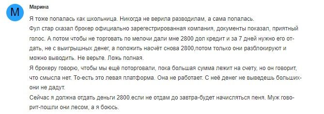Еще один пострадавший от развода называет «Фуллстар» «кухней». Человек на горьком опыте узнал, что аферист дерет огромные: