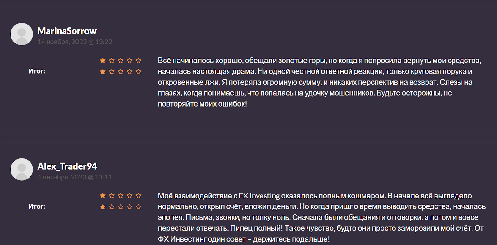 Что касается миссии и целей сервиса, FXinvesting позиционировал себя как платформу для трейдинга, обещая клиентам качественный сервис и выгодные условия для заработка на финансовых рынках. В тоже время если учитывать комментарии экс-клиентов, все указывает на то, что фирма не выполняет ничего из обещанного.