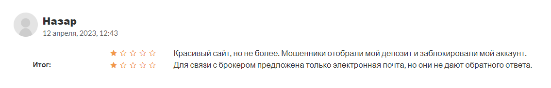 Пользователь по имени Назар отмечает, что сайт красивый, но на этом плюсы заканчиваются. Они развели его на депозит, а потом заблокировали аккаунт. Он пытался связаться с технической поддержкой, используя указанные на площадке номер телефона и электронной почты, но безрезультатно. Ответа Назар не получил.