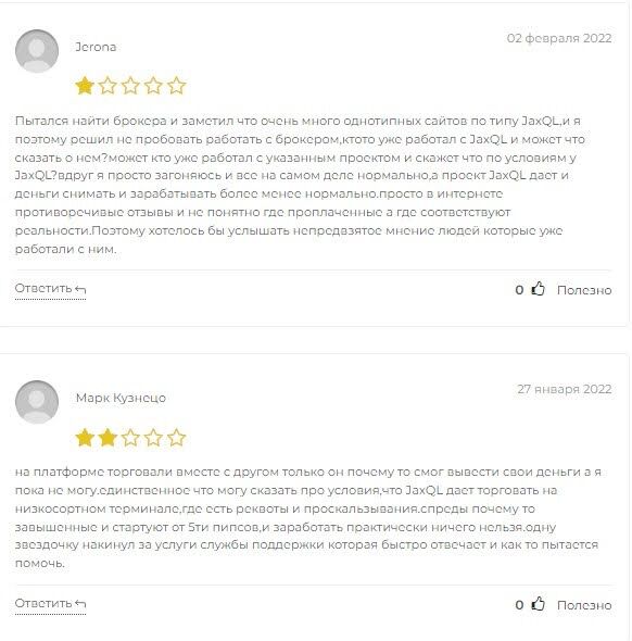 Отзывы клиентов — один из основных критериев, влияющих на расположение брокера в рейтинге лучших компаний. Увидеть все отзывы о JaxQL Вы можете на официальном сайте компании.