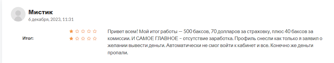 Пользователь под ником Мистик жалуется на то, что потерял на площадке 500$, а кроме этой суммы с него сняли 40$ комиссий. Заработать ему не удалось. Но как только он захотел вывести свои деньги, его аккаунт оказался заблокирован.