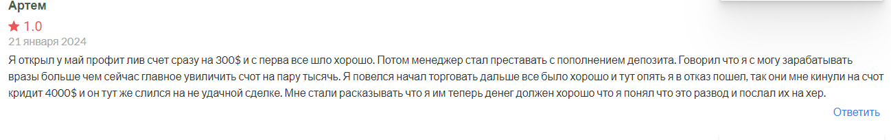 Артем рассказывает, что внес 300$ на депозит, и сначала все было хорошо. Потом менеджер начал настаивать на увеличении депозита. Ему было сказано, что он сможет зарабатывать в несколько раз больше, если внесет несколько тысяч. Пользователь так и сделал, и тут сделки начали идти в минус. Контора якобы ему выдала кредит на 4000$, и он тоже был слит. Мошенники начали требовать с клиента погашения кредита, но тот понял, что это развод.