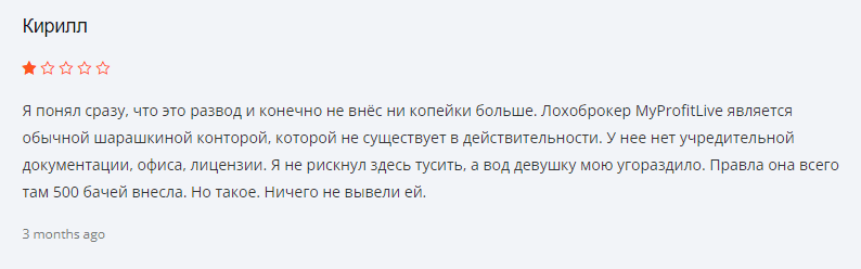 Обзор MyProfitLive дал возможность выяснить, чем на самом деле занимаются создатели этой торговой площадки. На счету этих мошенников множество обманутых начинающих трейдеров, которые не стали проверять данные конторы.