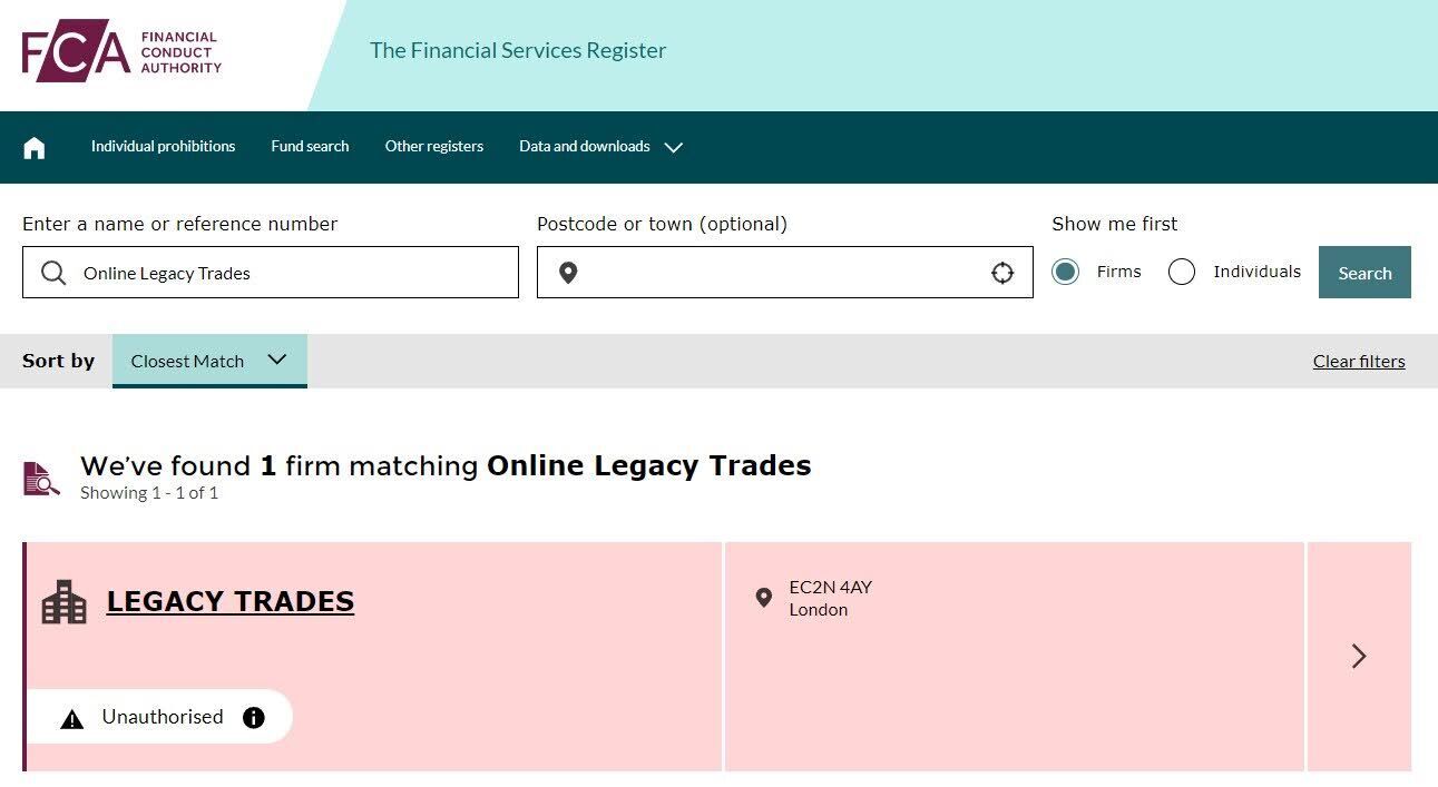FCA слышал про Legacy Trades. Британский регулятор предостерегает: это неавторизованная организация. То есть она не может предоставлять услуги брокера на территории Великобритании.