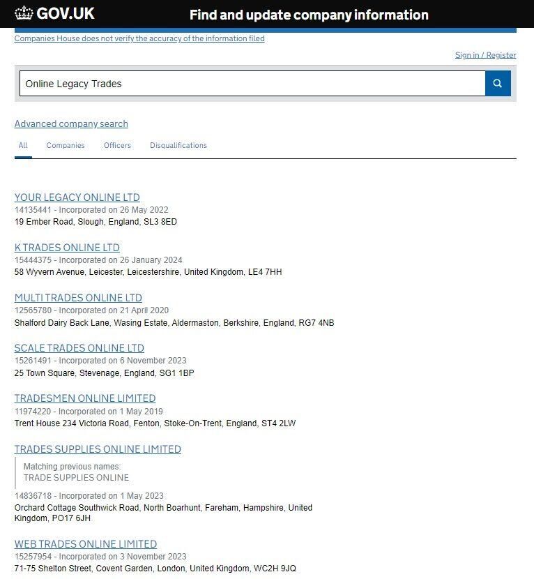 Мошенник «Онлайн Легаси Трейдс» шуршит: 5 лет регулируется на территории Великобритании. При таком раскладе у него должна быть местная регистрация. Проверка реестра юриков дала понять: нашего героя там определенно нет.