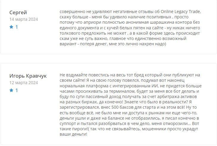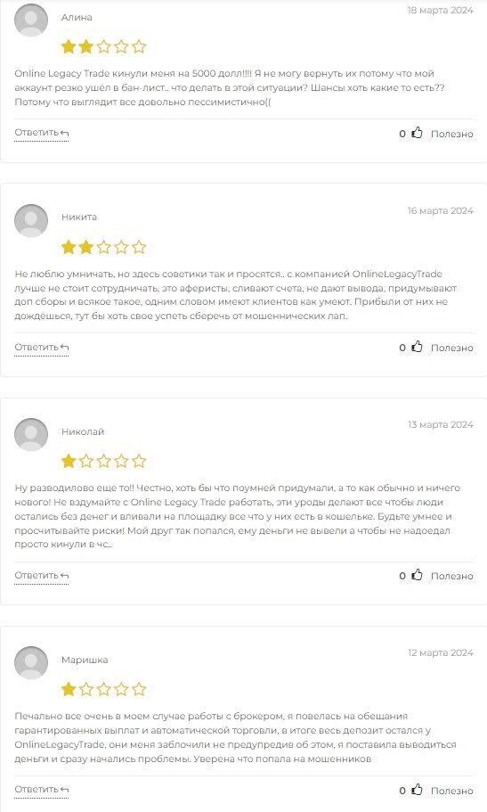 Одних тухлый аферист сливает сразу же. Других долго маринует, организовывая убыточные сделки. Ни у тех, ни у других не получилось сделать вывод денег от «Онлайн Легаси Трейдс».