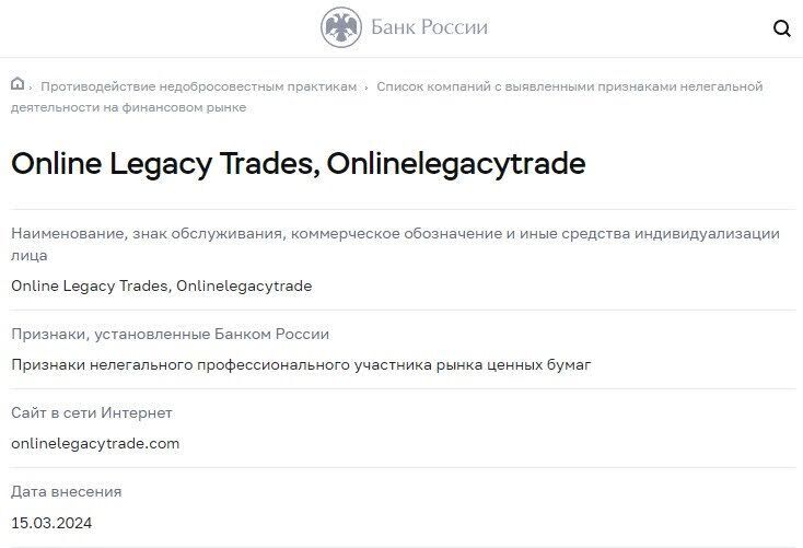 Единственный надзорный орган, которому знаком «Онлайн Легаси Трейдс», который угнездился на сайте onlinelegacytrade.com, — Банк России. Регулятор отправил шарашкину контору в черный список в 15 марта 2024-го. Это наказание за признаки лохотрона без всяких документов.