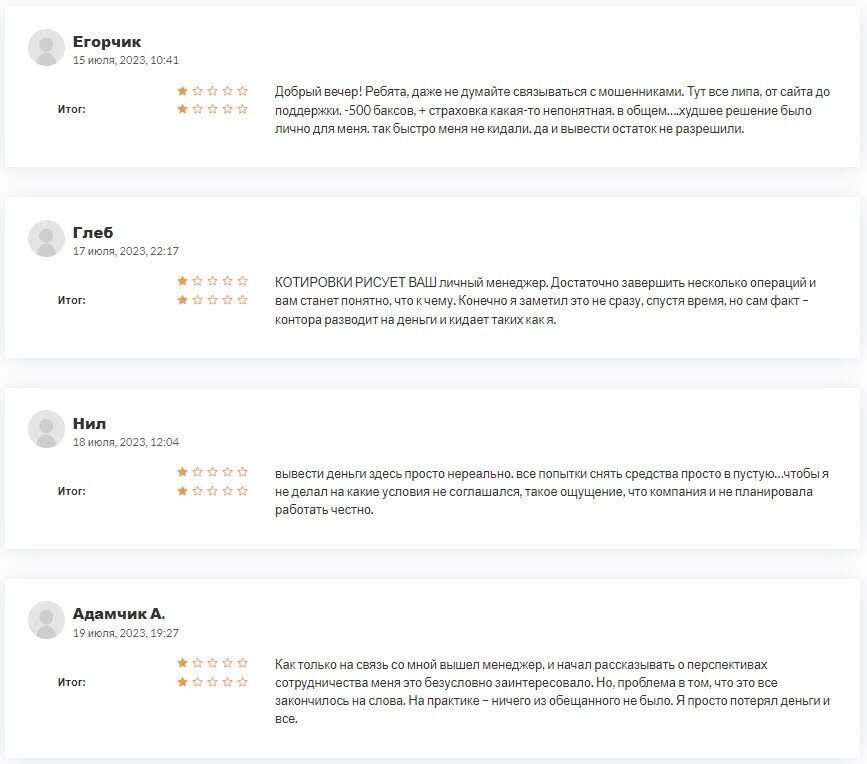 Тут мошенником несет за километр сразу видно что никаких документов нет условия торговли мутные. Скажите ну какие брокеры придлагают бонусы в инвестиционых планах в чем вобще смысл таких придложений кроме дешевой заманухи. И таких вот убогих жуликов полный интернет я немогу понять как они вобще рыбку ловят потому что схемы их совершено неменяются людей кидают пачками и все равно находиться лошок который думает что он не дурак и его точно ни обманут.