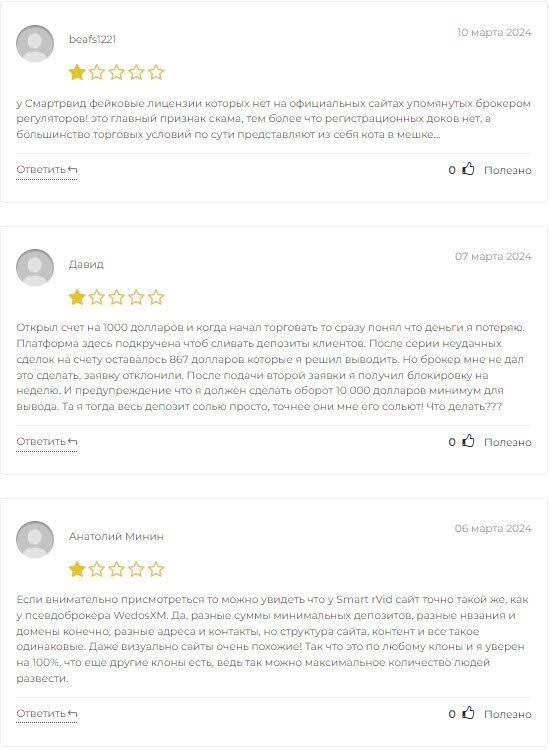 Подробности про схемы кидалова на деньги, которые использует «Смарт арВид», дают честные отзывы бывших пациентов. Один из бедолаг высказался на brokertribunal.com. Он предупреждает: у кидалы куча клонов. Все они созданы одними и теми же мошенниками. Цель — набивать свои карманы. О реальном трейдинге не может быть и речи.