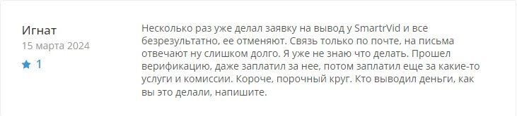Реальные отзывы ломятся от жалоб на обман. Каждый, кто открыл «Личный кабинет» у Smart rVid, потерял свой капитал.