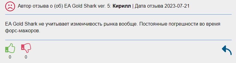 Не все в сети позитивные отзывы Gold Shark EA. Кирилл пишет, что программа не учитывает изменчивость рынка. Во время форс-мажорных ситуаций бывают погрешности.