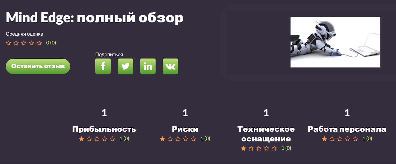 Mind Edge — советник, который предлагает пользователям стабильный заработок благодаря оформлению подписки на качественного инновационного робота, способного предоставить трейдерам весьма выгодные условия для торговли. Сами разработчики не предоставляют практически никакой информации относительно работы своего детища. По этой причине специалисты Рейтинга Брокеров на практике проверили надежность функционирования этого сервиса, в том числе проверке подверглись индикаторы и основные параметры действия данной торговой системы.