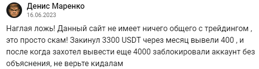 Этому трейдеру дали возможность получить совсем маленькую сумму для того, чтобы он продолжил работать с компанией. Вывести все деньги ему не позволили и просто молча заблокировали его аккаунт. Естественно, чужие деньги мошенники быстро слили в нужном для себя направлении (отзыв взят на vc.ru).