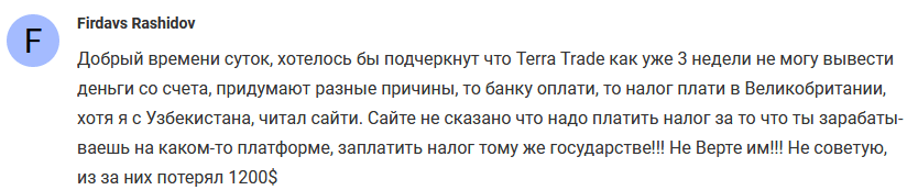 Много интересного можно узнать с отзывов и других обзоров о компании. О Terra Trade отзывы в большинстве случаев носят негативный либо же нейтральный характер. Положительные комментарии о брокере тоже можно найти в сети, но чаще всего они все размещены на одном ресурсе. Это указывает на то, что мошенники практикуют покупку таких отзывов и платят за их размещение на нужных им сайтах. Поэтому, инвесторам следует ознакомиться с откликами на разных форумах и сайтах. Ниже вы можете почитать то, что на самом деле говорят реальные бывшие клиенты этого лохотрона.