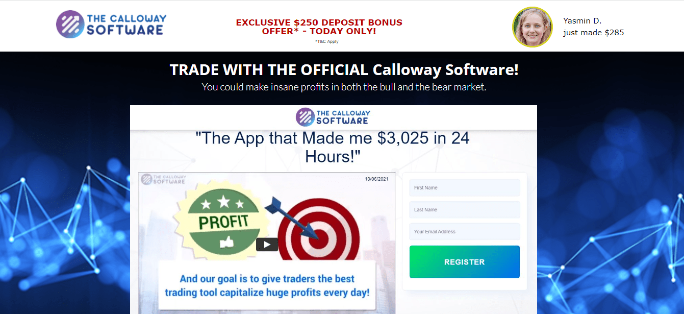 Осмотр брокера The Calloway Software не внес ясности чем на самом деле занимается сайт. Он позиционирует себя, как передовую международную площадку для торговли на всех мировых фондовых и криптовалютных биржах. Там не указано условий торговли. Но вверху страницы есть реклама, что к депозиту они дают бонус 250$.