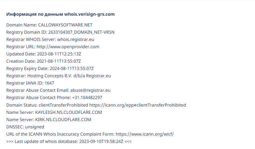 Еще одна проверка показывает, что домен был создан в 2021 году, а его обновление произошло в 2023 г., когда аферисты купили уже готовый домен с историей, чтобы у трейдеров не возникло подозрения в том, что сайт работает с августа 2023 года и у него нет стажа.
